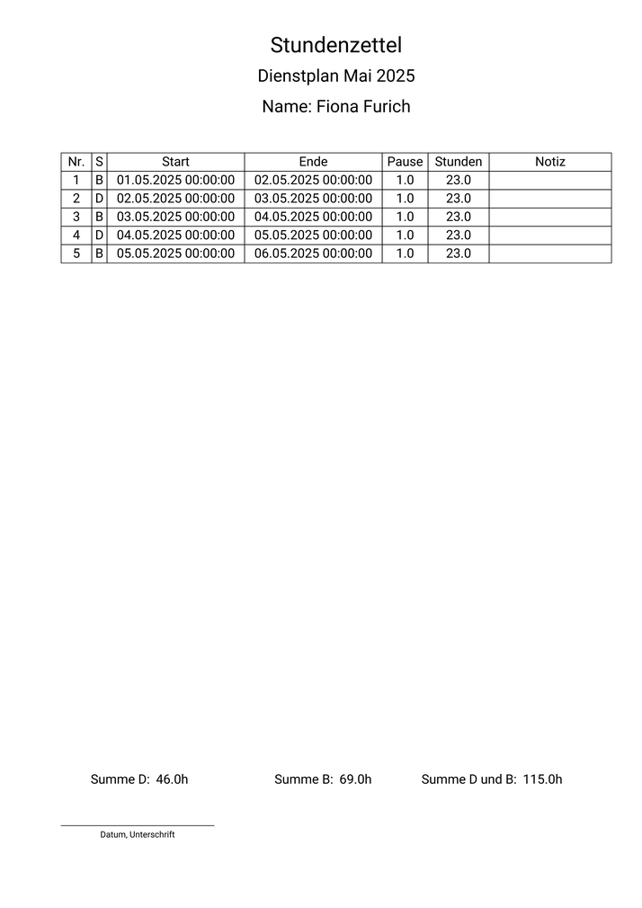 Der tabellarische Aufbau zeigt ob Bereitschaft oder Dienst war, die Start- End- und Pausenzeit, sowie die sich daraus ergebenden Arbeitsstunden. Diese werden in drei verschiedenen Darstellungsformen am ende der Tabelle angezeigt. Zusätzlich gibt es noch ein Feld Notizen, das aus den Kacheln übertragen wird. Hier können nützlihe Informationen zur Erklärung eines Sachverhalts hinterlegt werden.